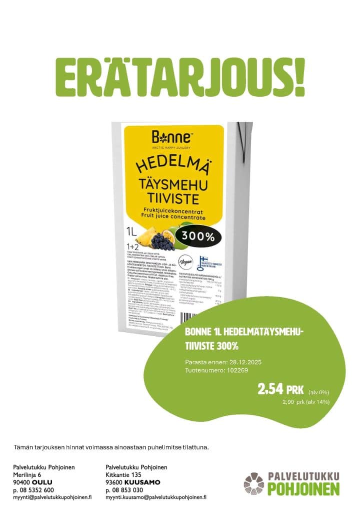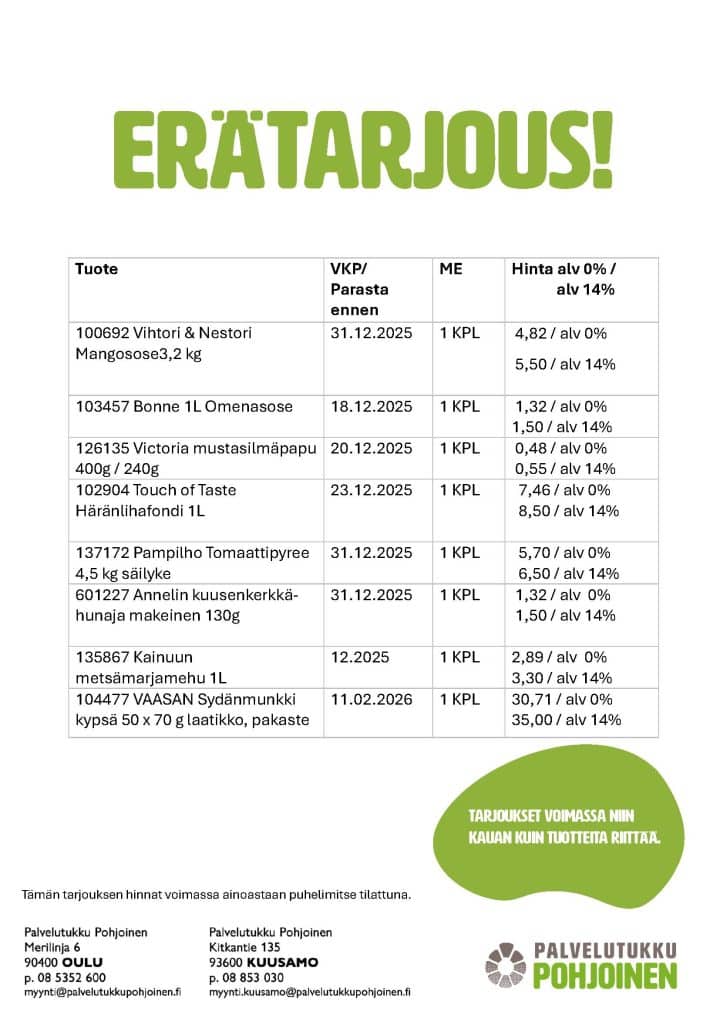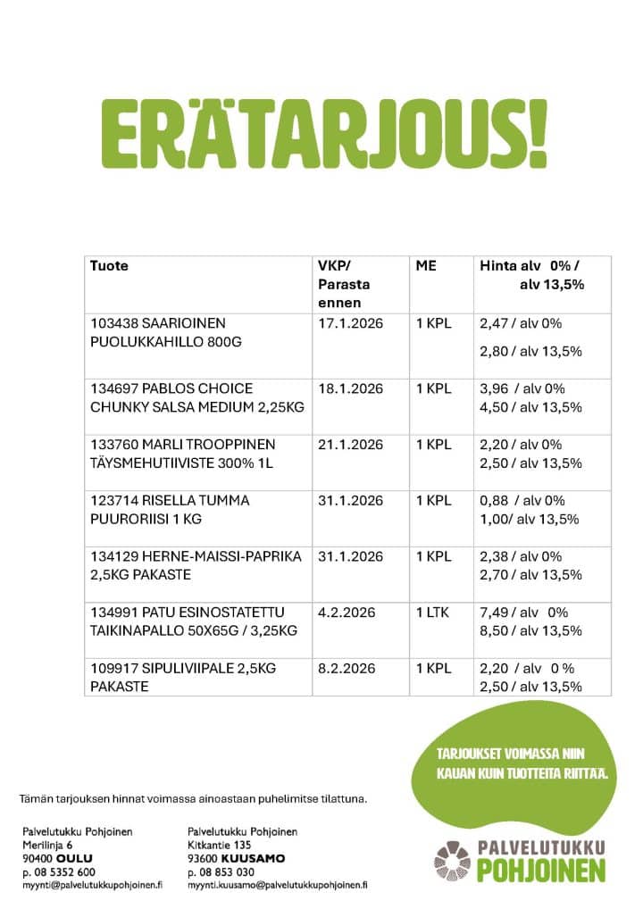 Myynti, p. (08) 5352 600 tai myynti@palvelutukkupohjoinen.fi